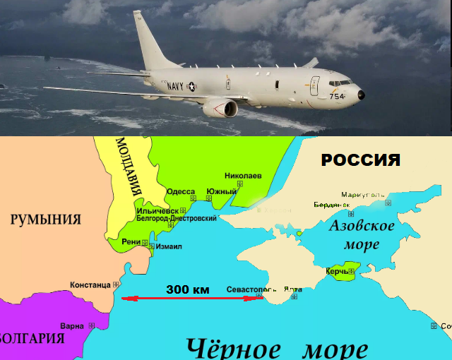 Над Черным морем у берегов Румынии летал Boeing P-8А Poseidon ВМС США. Это патрульный противолодочный самолет, основной задачей которого является обнаружение подводных лодок. Однако, может использоваться и как разведчик. По некоторым данным, современные радары "Посейдона", способны засекать цели на расстоянии до 350 км. Но даже если и меньше, то ничто ему не мешает чуть подальше отлететь от румынского берега.