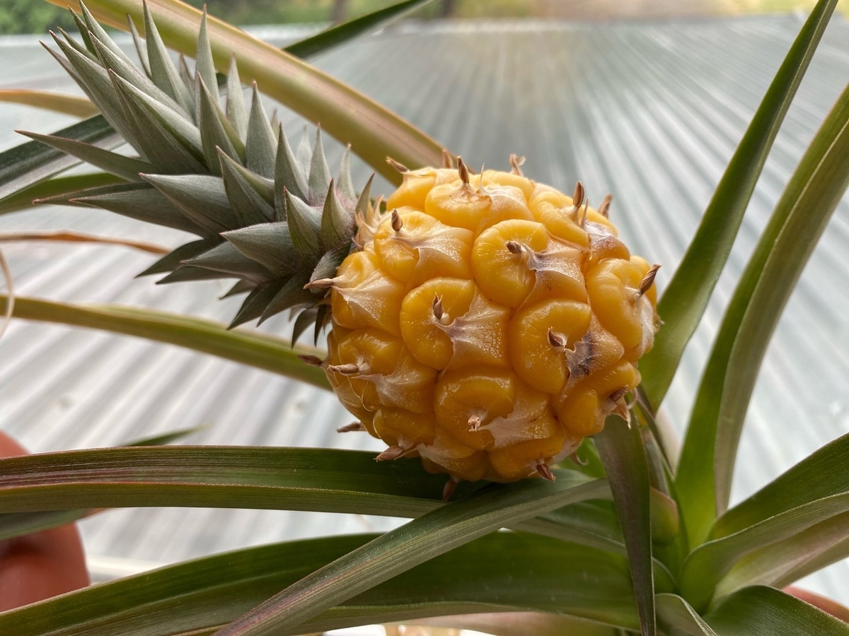 Этому ананасу уже лет 6-ть, старичок . Нижняя часть высохла и питание из земли растение уже не могло получать. Последние пару месяцев держался буквально на воде с хлореллой , которую наливала непосредственно внутрь розетки. Чтобы поддержать растюшку и дать плоду созреть. Очень уж длительный процесс созревания , 4 - 6 -ть месяцев.