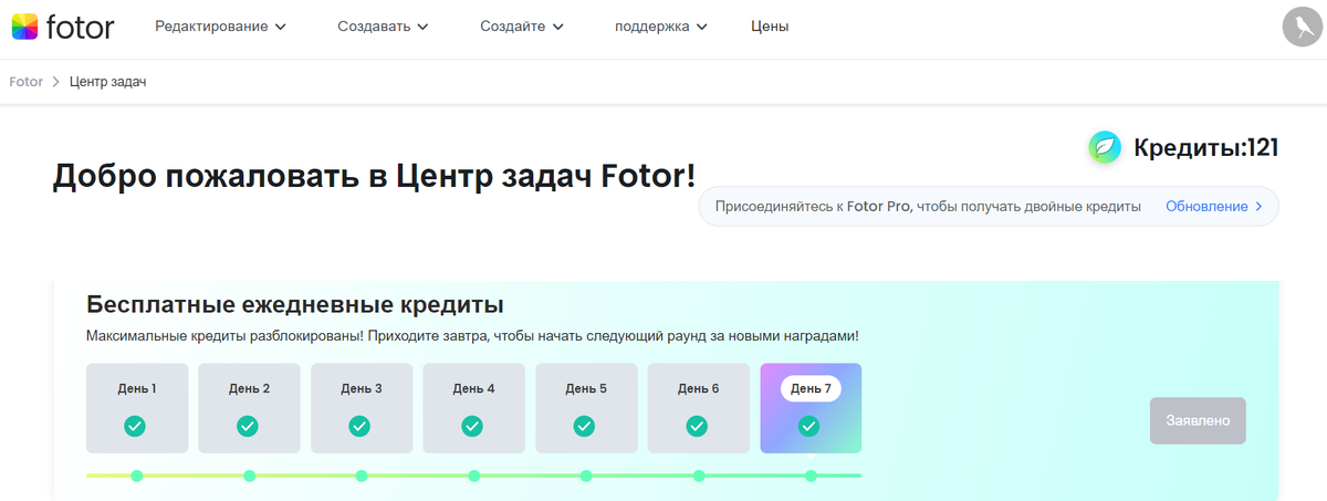 Но с недавних пор на Fotorе стали выдавать кредиты по-другому и, если заходить ежедневно, то можно даже получить не два, а сразу двадцать кредитов.