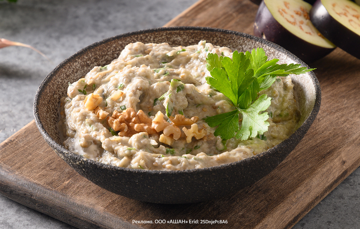 соль — щепотка; черный перец — щепотка; красный перец — щепотка. Готовим! Шаг 1 Проколите баклажаны вилкой, смажьте оливковым маслом и отправьте на противне в духовку при 170 °C на 45–50 минут. Баклажаны должны стать мягкими. Шаг 2 Очистите чеснок, смажьте оливковым маслом и запеките его в духовке с баклажанами, но минут 15–20. Шаг 3 Достаньте готовые баклажаны, накройте фольгой и оставьте до полного остывания. Шаг 4 Пока остывают баклажаны, приготовим тахини. Эта кунжутная паста — один из самых главных компонентов б