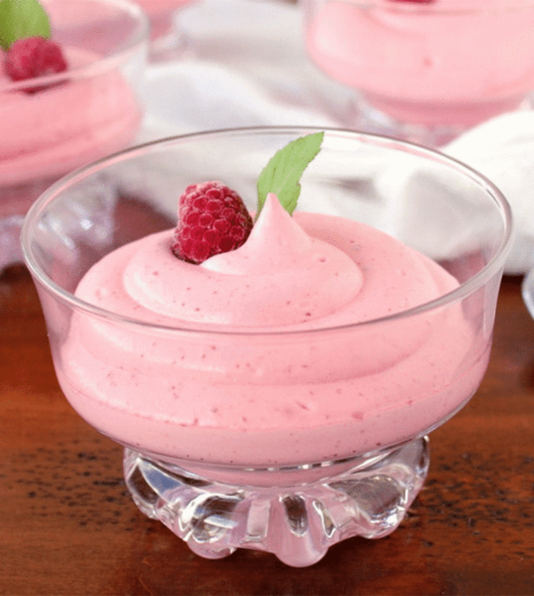Ингредиенты. 400г малины 4шт. яичных белка 100 г сахара 2 ч.ложки желатина Способ приготовления. Белки взбить, добавить 1 ст.ложки сахарного песка, подмешать в смесь протертые ягоды с сахаром . Желатин развести в воде до набухание добавляем в смесь и взбить . Подавать мусс с холодным молоко