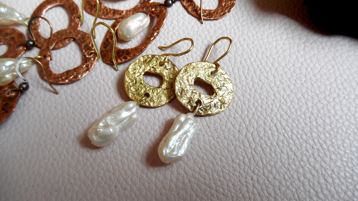 Однажды, изготавливая серьги, мне понадобились бусины нестандартной формы, обычные бусины просто не подходили по стилю, форме и цвету к фактуре мятого металла. Мне сразу пришла мысль о барочном жемчуге, но его у меня не было. Стал вопрос, как имитировать барочный жемчуг и делать те формы, которые тебе нужны в ограниченном количестве, чтобы не покупать целую нить одинаковых бусин из барочного жемчуга. Посмотрите ниже, какого результата я достигла по форме и цвету бусин для серёг: Чтобы сделать две похожие подвески для пары серёг в виде бусин из барочного жемчуга, мне понадобилось не более 15 минут, 2 пина, клей-пистолет и перламутровый лак для ногтей. Действия очень простые. Я укоротила пин и держала его за петлю. Наплавляла клей на пин, придавая ему нужную форму. Затем покрыла их перламутровым лаком для ногтей. Если эта идея вам понравилась, жду от вас отклик и не забывайте поставить лайк. Полный МК по имитации барочного жемчуга вы можете посмотреть прямо здесь: Приглашаю вас посетить