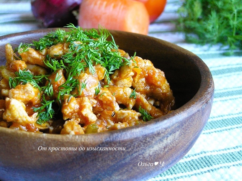 зелень Приготовление: Филе индейки мелко нарежьте, присолите, добавьте паприку, перемешайте и оставьте на 20-30 минут. Мелко нарежьте лук (сразу присолите), сельдерей и перчик чили, натрите морковь. Выложите все вместе в кастрюльку с толстым дном с разогретым в ней растительным маслом. ***Я готовила полпорции в большой сковороде.*** Обжарьте. Добавьте подготовленную индейку, щедро посыпьте карри, перемешайте, обжарьте все вместе. Добавьте мелко нарезанные помидоры, перемешайте, немного потомите. Всыпьте мелко нарезанный чеснок, перемешайте. Затем влейте измельченные томаты в собственном соку или томатное пюре. Гото