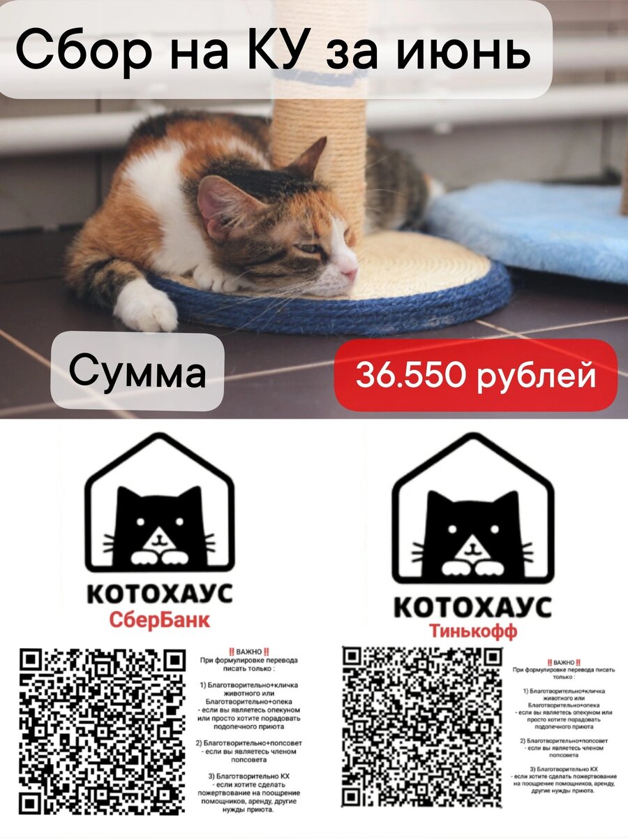 🆘СБОР НА ОПЛАТУ КУ ЗА ИЮНЬ. Актуальная информация🆘 Начало сбора: https://vk.com/wall-6215508_27264 3⃣6⃣.5⃣5⃣0⃣ рублей осталось собрать для закрытия счётов за КУ июня. Это уже целая половина, от необходимой суммы! 🥰 Медленно, но верно, с вашей помощью мы закрываем этот обширный сбор, спасибо!🙏 Сумма сбора - 64.000 рублей (ориентируясь на счета за май): - ТГК 20.000 рублей - Водоканал 10.000 рублей - ПСК 13.400 рублей - Вывоз мусора 6.600 - Аренда контейнеров - 3.600 рублей (оплачено) ✅ - Обслуживание здания в ЖКС 14.000 рублей - Аренда здания+НДС 17.380 рублей (оплачено) ✅ Собрать эту сумму реально, если объединиться, если максимально активно распространять информацию❤🔥 Помочь может каждый любой посильной для него суммой! Пожалуйста, ПОДЕЛИТЕСЬ ЗАПИСЬЮ с друзьями, коллегами, всеми, кто не пройдет мимо😿 ‼ВАЖНО‼ При формулировке перевода писать только (все формулировки без "благотворительно" облагаются налогом!): Благотворительно КХ КУ 📳Реквизиты д