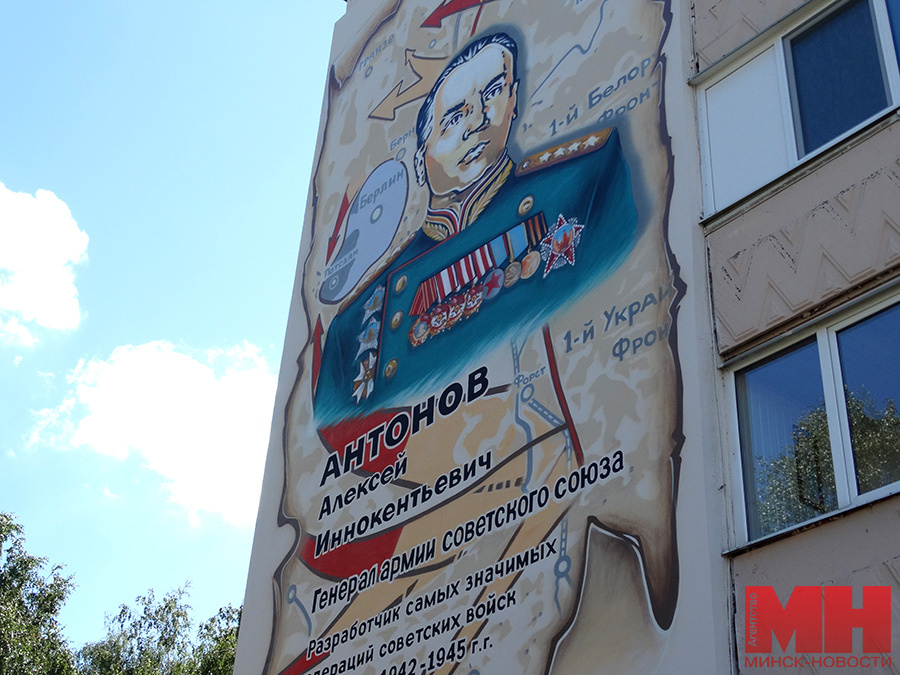 Мурал в честь генерала армии Алексея Антонова торжественно открыли на ул. Выготского 26 июня, передает корреспондент агентства «Минск-Новости». В церемонии приняли участие активисты БРСМ, председатель Минского городского Совета депутатов Артём Цуран, представители администрации Центрального района, сотрудники организаций и предприятий. — Важно, что мы встречаемся, вспоминаем героев войны. Генерал Алексей Антонов был разработчиком основных операций Советского Союза, сыграл значительную роль в соглашениях с союзниками, в формировании миропорядка после окончания Второй мировой войны. Знать о таких личностях – это не просто правильно, это наш долг, — отметил А. Цуран. — Среди собравшихся есть те, кто еще застал советское образование и героев войны, мы общались с ними лично. Важно передать эту память молодежи, лишний раз напомнить ей, что мир дался очень дорогой ценой. Отмечалось, что А. Антонов — единственный советский военачальник, награжденный орденом «Победа» в звании генерала армии, и