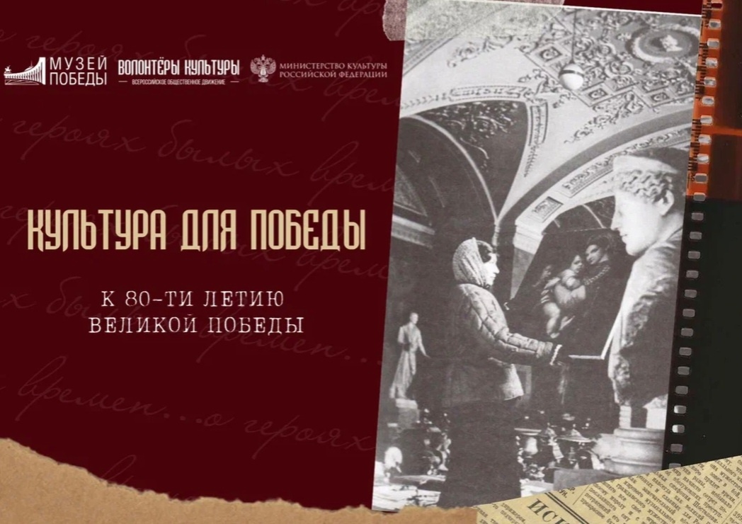В память 83-й годовщины начала Великой Отечественной войны Всероссийское общественное движение «Волонтёры культуры», Музей Победы, Министерство культуры РФ и Роскультпроект объявляем о запуске Всероссийской акции «Культура для Победы», посвящённой сохранению памяти о деятелях культуры в период Великой Отечественной войны. Во времена Великой Отечественной войны, самой разрушительной и кровопролитной в истории человечества, многие деятели культуры поднимали боевой дух солдат, участвовали в агитационных бригадах и продолжали творить даже в самые тяжёлые моменты. Мы хотим сохранить память о них и их вкладе в Победу! Акция включает в себя: — сбор информации о деятелях культуры и искусства во время войны. — работа с архивами, семейными фотографиями, фронтовыми письмами и воспоминаниями, чтобы создать подробные истории этих культурных героев. Участники смогут добавить историю своего героя во Всенародный исторический проект «Лица Победы». В очном формате Акции по всей стране на базе учреждений