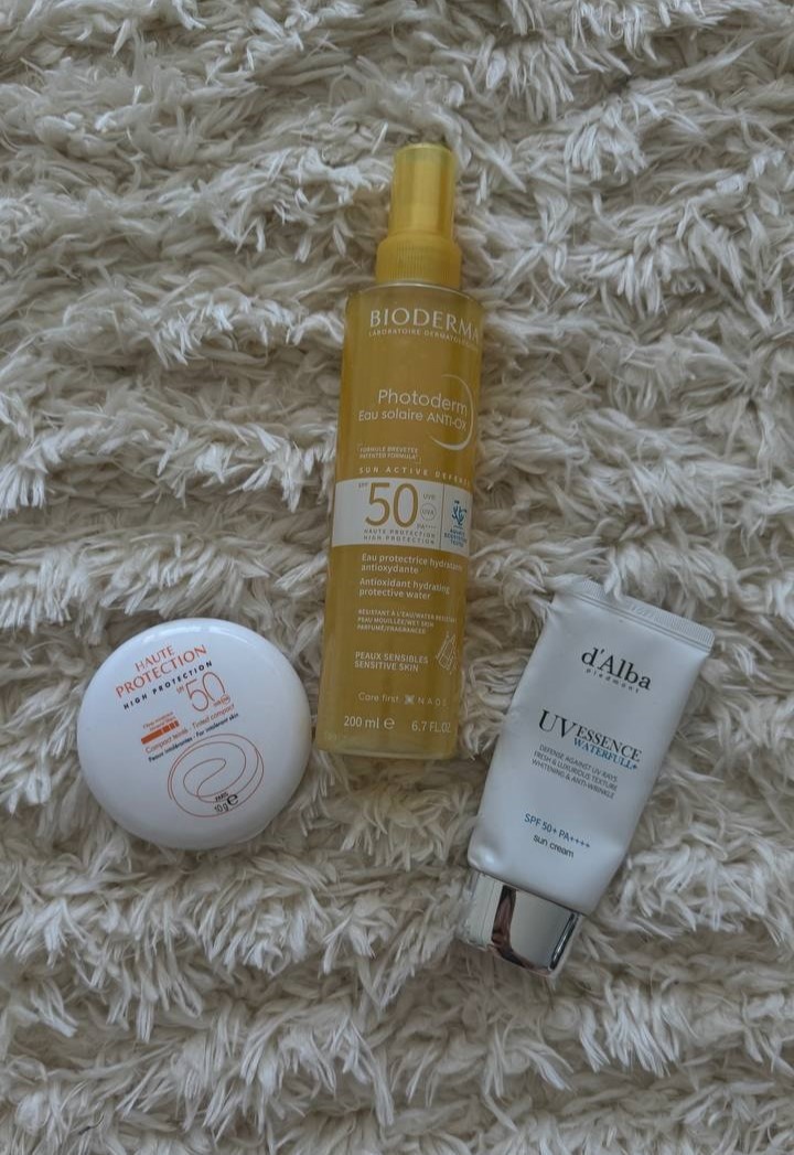 Друзья, всем привет! Лето уже в самом разгаре. Поэтому я решила собрать свою подборку солнцезащитных средств. Это то, что у меня всегда под рукой и лежит в сумке. Для начала скажу, что пользуюсь ими ВСЕГДА! Независимо от дождей, облаков, времени суток и локации — хоть в России, хоть в Турции мои любимчики везде со мной. Крем для лица d'Alba Waterfull Essence Sun cream SPF50+/PA++++, 50мл Зайду сразу с достоинств: крем у меня почти закончился. Использовать его обожаю. Почему? Иногда от разных SPF (а попробовала я очень много) у меня появляются небольшие высыпания или аллергия. С этим нет никаких проблем. За кожу я уже не переживаю. Только помните: у нас разный организм, поэтому мой любимый крем может не подойти именно вашей коже, так что экспериментируйте. У него легкая текстура. Он довольно жидкий, но наносить летом его комфортно. Не надо размазывать плотную “мазь” по разгоряченной коже. Быстро впитывается, не оставляет пленки и белых полос на лице. Крем веганский и это подтверждено се