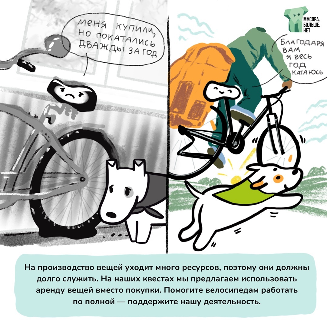 На квестах и экоуроках «Мусора.Больше.Нет» предлагает использовать аренду вещей вместо покупки. Это выгоднее для вас и окружающей среды. Другой вариант — купить б/у велосипед, если не планируете использовать его ежедневно и на большие расстояния.
