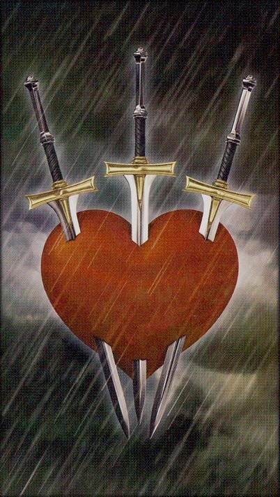 Тройка мечей Распространенные значения Тройки Мечей — разочарования, утраты и потери, связанные с крахом надежд и несовпадающими интересами. Аркан приносит в жизнь ссоры и противоречия, вызывая злость и обиду там, где еще недавно была гармония. Вам придется руководствоваться разумом, а не сердцем, совершая важный выбор, и возможно, отказаться от многого. Также по этой карте проходят расставания и разрывы. Стороны расходятся с болезненными чувствами, а не миролюбиво. Остаться в хороших отношениях после такого разрыва просто невозможно. ожидает сложный период, полный потерь и безрадостных событий. Черной полосы нельзя будет избежать, и все, что остается — с готовностью и холодным рассудком принять удары судьбы, а также распрощаться с тем, что уже нельзя удержать рядом с собой. Следует понимать, что жестокая реальность преподносит хороший урок, показывая возможность для внутреннего роста. А он, чаще всего, бывает очень болезненным. Выбор, который пришлось сделать вопреки своим чувств