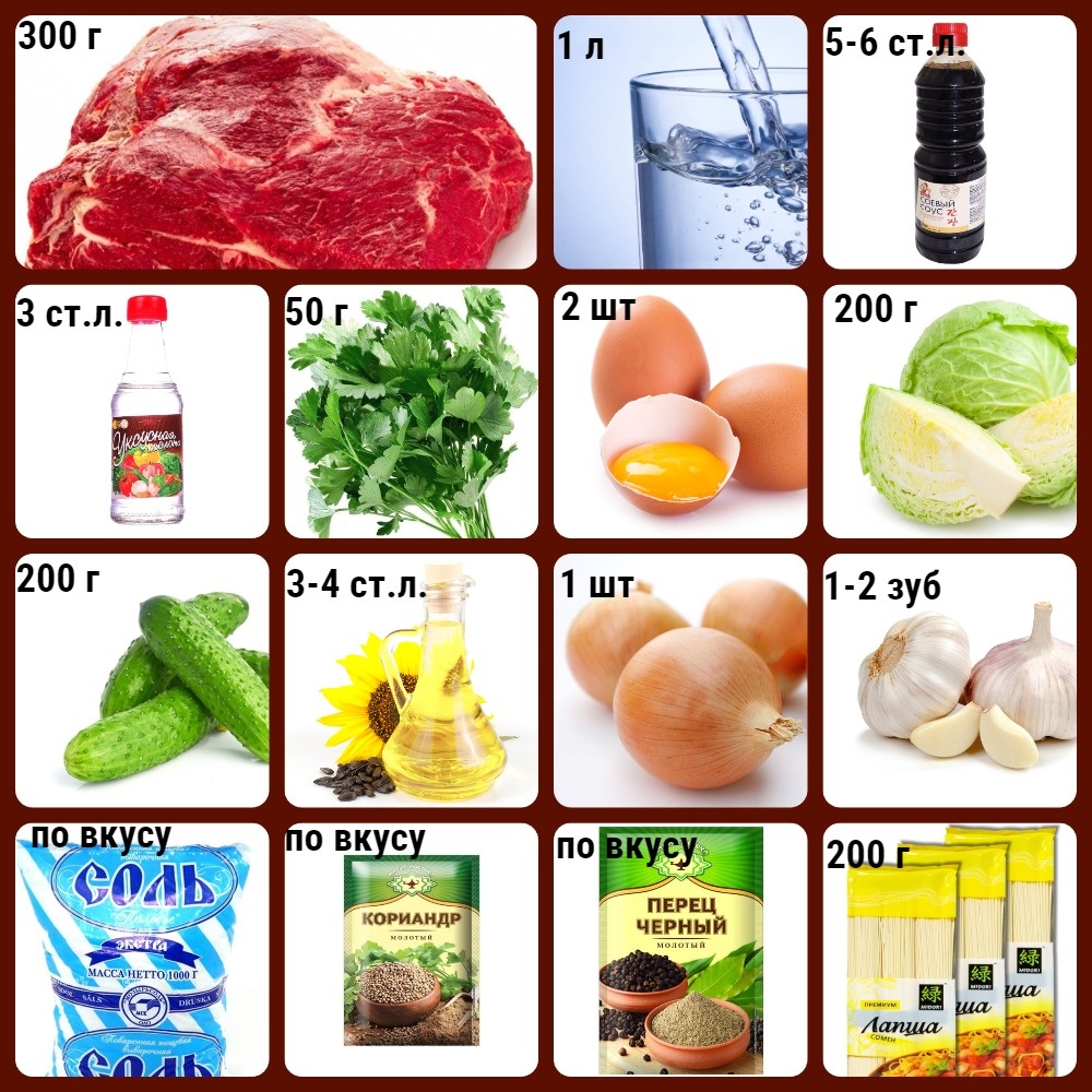 Как делать тот самый "правильный" суп - кукси меня не спрашивайте! Посмотрите лучше в сети. Ну, а я расскажу как делать вкусный. На 2 порции, не жадные порции или 3 поменьше! Нюансы: Говядину можно заменить на другое мясо, можно даже отварное. Кинзы можно больше, если любите. Белокочанную капусту легко меняем на пекинскую. Соевый соус у меня очень соленый, пробуйте свой обязательно. И уксус варьируйте, у меня было покислее, налили ложку, попробовали, размешали.может понадобиться меньше Забыла вставить в коллаж сахар, тут 1,5 ст.л. Калорийность очень маленькая - 91,31 ккал/100 г. Суп отлично освежает в жаркую погоду, но попрыгать с приготовлением конечно придется. Но смею Вас заверить , результат не опечалит! Делаем все параллельно. Хотя некоторые вещи можно сделать заранее Шаг 1 Готовим заправку. В холодной воде растворяем соевый соус, сахар и уксусную эссенцию, это важно! Обязательно пробуем, может понадобиться меньше или больше сахара, соуса и уксуса. У вас получится сладко-соленая