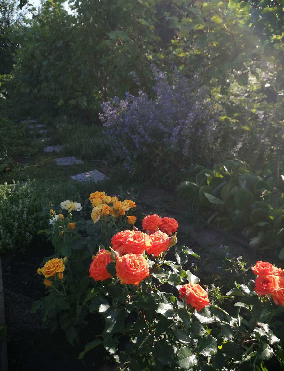 А вот не надо филонить и не ездить в сад аж пять дней. В жару. Потому что когда я была там последний раз, розы только-только собирались цвести. И такого подвоха я от них точно никак не ожидала... Приехала - а часть уже не просто цветет, они отцвели! Но все по порядку. Нынче я убрала из ряда 'Kelly' - 'Sun Sity' - 'Lovely Green' последнюю. Не потому, что она мне не нравилась, вовсе даже наоборот. Но на полном солнце она постоянно "сохатила" первую волну цветения. Поэтому сейчас ряд выглядит так - 'Kelly' - 'Sun Sity' - 'Mashad'. И - ура - наконец мне все нравится. (А за 'Lovely Green' не переживайте - я ее весной просто пересадила в полутень, как и надо было сделать с самого начала) Красавица 'Kelly', которая перезимовала нынче из рук вон плохо, тем не менее выше всех спреек и цветет так, что ах! Ей повезло с жарой, как это ни странно звучит. Но она очень плохо держит дождь, а тут дождей просто нет. Очень красивая роза - туго набитые цветки, лепестки которых она не роняет даже тогда, к