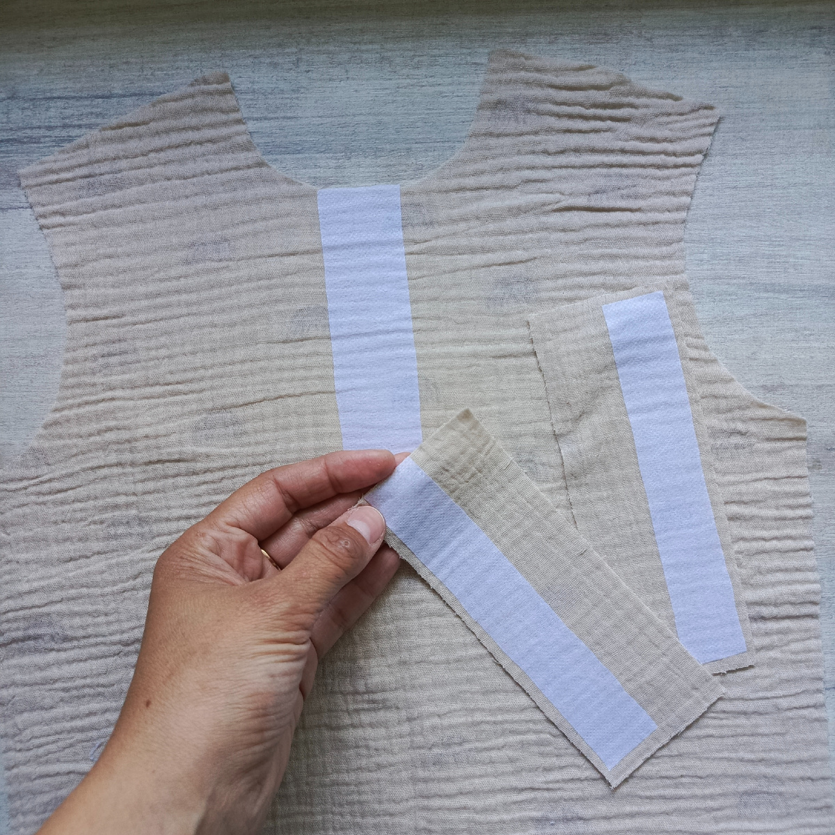 Ох, как мне нравятся эти рубашки из муслина! И почему я раньше их не шила? Младшему сыну повезло больше всех: у него их целая коллекция ))) Шью очередную рубашку и заодно зафотографировала процесс изготовления застёжки поло. Вдруг кому пригодится? Итак, первым делом проклеиваем флизелином детали планки и место на полочке, где будет располагаться застёжка. Ширина планки в готовом виде у меня будет 2 см, поэтому ширина детали планки получается 4 см + 2 см припусков с каждой стороны. Для того, чтобы планка получилась ровненькой, я делаю так: сгибаю ее пополам и приутюживаю. От линии сгиба откладываю 2 см и провожу линию, по которой буду пришивать планку. На полочке также провожу вспомогательные линии: центральную и от нее откладываю по 1 см влево/вправо. На полочке линии наносим на лицевую сторону! Детали планки размещаю на полочке таким образом, чтобы линии совпали (лицом к лицу!). Расстоянии между линиями должно быть равно ширине планки в готовом виде (у меня 2 см). Отмечаю место, где