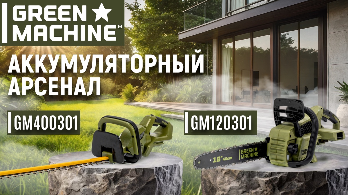Цепная пила GM120301 и кусторез GM400301 - основа садового аккумуляторного арсенала от GREEN MACHINE. Эти мощные и функциональные агрегаты прекрасно подойдут для выполнения широкого перечня интенсивных работ, как в частном домохозяйстве, так и в профессиональной сфере. Начнем с аккумуляторной цепной пилы GREEN MACHINE GM120301. Агрегат создан для частого применения и интенсивных нагрузок. Цепь и шина изготовлены по технологии компании OREGON, ведущего мирового производителя пильных гарнитур. Модель совместима с аккумулятором 62-вольтовым аккумулятором GMA534 емкостью 4 Ач. Пила оборудована автоматическим тормозом цепи и предохранителем от случайного пуска. Натяжение режущей гарнитуры GREEN MACHINE GM120301 происходит безинструментально, что очень удобно. Смазка цепи происходит автоматически. Крышка емкости для масла оборудована крышкой с защитой от утери. Агрегат очень легок и практичен в использовании. Вторая новинка бренда - аккумуляторный кусторез GREEN MACHINE GM400301. Аппарат раб
