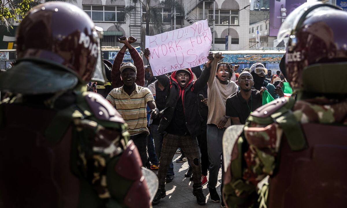 01 • Протесты в Кении из-за попытки властей повысить налоги. 23 погибли, 30 ранены. Президент объявил чрезвычайное положение и ввёл войска в столицу. [Надпись на плакате: президент Руто, ты работаешь на нас! Мы твой начальник!]
