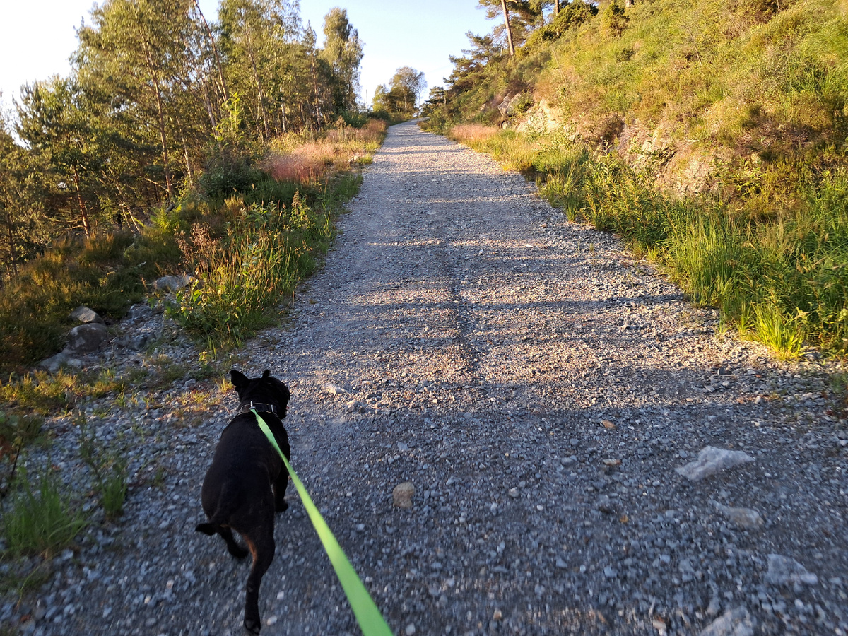 У нас опять гостит стаффордширский терьер Ару. Сегодня сочетаю приятное с полезным. Выгуливаю пса и собираю чернику. Вчера, во время участия в поисках пропавшей женщины, я увидела, что она уже созрела . Чуть раньше, чем обычно. Идем-взбираемся на ближайший холм. Идти по дороге даже приятно. Щебенка под ногами хорошо укатана. Я люблю заниматься сбором ягод именно на этом холме, поскольку здесь из животных обитают лишь ежи и лисы, оленей не видно, и поэтому почти нет клещей. И идти далеко не надо. 10 минут пешком, и я на месте. Приходится, правда, трудновато взбираться от дороги на вершину холма, где ягоды и растут. Нравится мне, что по дороге на плакатах можно прочитать о встречающихся здесь животных и птицах. Моя ягодная плантация располагается в кустах по сторонам от туристической тропы. В этом году ягод не очень много на кустах, но зато черника уродилась крупная, легко собирается. Прогулялись с Ару с полчаса, набрали с ним около пол литра черники. Все же с собакой не удобно яг