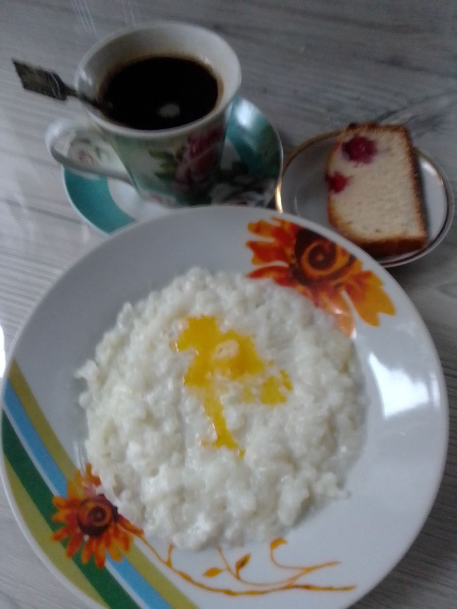у нас сегодня молочная рисовая каша с сахаром и сливочным маслом. Это одна из любимых моих каш. В такую кашу я не люблю добавлять ягоды. Ее я варила еще вчера специально на сегодняшний завтрак. Утром поставила в микроволновку на 2 минуты при мощности 600 вт. Пью как всегда черный кофе без сахара с кусочком бисквита, который пекла вчера. Получился вкусный и полезный завтрак.