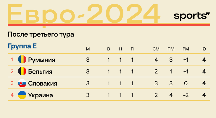 У всех в группе E по 4 очка. Почему Румыния в плей-офф с первого места, а Украина вылетела с последнего?