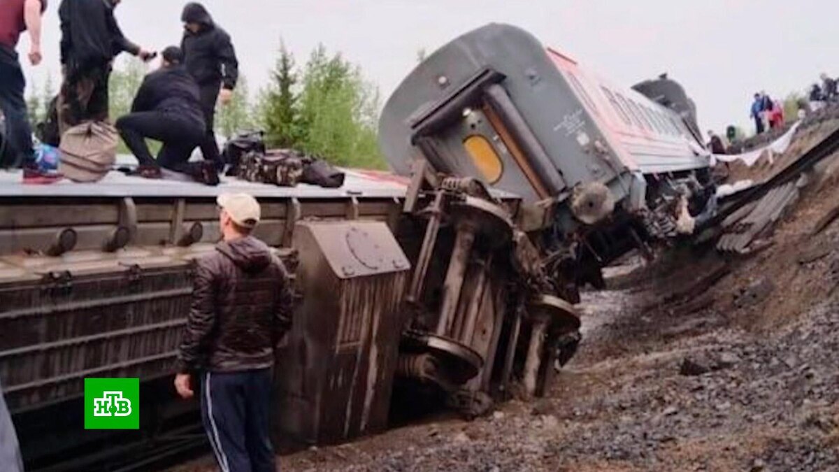 [ Смотреть видео на сайте НТВ ] Бригады скорой помощи доставили в больницы Инты 14 пострадавших в результате схода с рельсов вагонов поезда Воркута — Новороссийск. Из них трое, в том числе ребенок, находятся в горбольнице Инты. Девять вагонов с пассажирами сошли с рельсов недалеко от железнодорожной станции Инта в Республике Коми. Уже появились первые кадры с места происшествия. В поезде находились более двухсот человек. К месту аварии были направлены оперативные службы, вылетели несколько вертолетов. Пострадавших с тяжелыми травмами везут в Инту. Движение поездов на участке приостановлено. Добраться до места аварии можно только по железной дороге либо по воздуху, других путей нет: вокруг тайга и болота. Изначально появились сообщения, что этим поездом в лагерь ехали несколько больших групп детей. Однако, в мэрии Воркуты сообщили, что организованных детских групп в вагонах не было, но дети среди пассажиров и в числе пострадавших есть. Спустя 10 минут после отправления от промежуточной