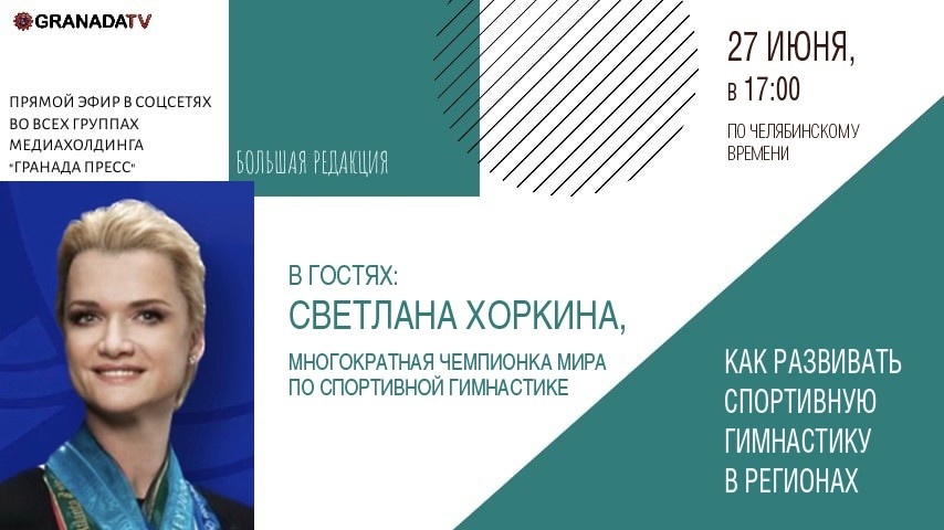 Визит в Челябинск Светланы Хоркиной, двукратной олимпийской чемпионки мира по спортивной гимнастике, проходит в рамках Всероссийского тура. В областном центре она встретится с юными спортсменами и гимнастами, которые имеют особенности развития, а также станет участницей круглого стола, темой которого станет развитие спортивной гимнастики в Челябинской области. А после этого Светлана Хоркина станет гостьей прямого эфира медиахолдинга «Гранада Пресс». В рамках встречи с журналистами «Большой редакции» спортсменка пообщается с представителями СМИ, а также ответит на вопросы зрителей, поступившие до начала трансляции и в течение эфира. Вопросы можно оставить в комментариях под трансляцией в группе «Гранада ТВ» или на официальных страницах изданий медиахолдинга «Гранада Пресс». Начало эфира в 17.00.