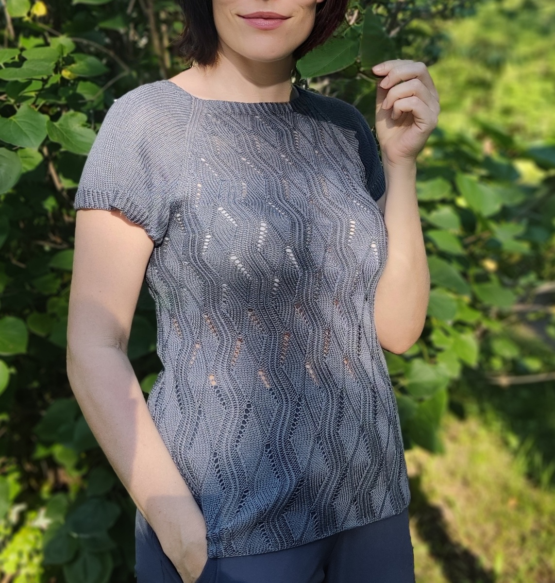 Всех приветствую у себя на страничке. Меня зовут Ольга, и я люблю вязать на спицах. Умею вязать многое, но на заказ только мелочи типа носков, митенок, перчаток и т д. Но сегодня покажу вам свои футболочки, которые ношу летом, ну и конечно же поделюсь схемами. Футболочки все связаны без ростка, классический реглан сверху. И для всех этих изделий использован шёлк глянцевый, без утолщений и пушинок, из чего я делаю вывод, что это длинноволокнистый Малбери шёлк. Он создается из коконов «домашних» шелкопрядов Bombyx mori. Эти бабочки не живут на воле, они выращиваются на фермах, где за ними ухаживают и кормят самым отборным сырьем – исключительно листьями тутовых деревьев. Серая футболка, что на заглавной фотографии связана из довольно ,,послушного,, шёлка Почему я его называю ,,послушным,, поймут многие вязальщицы, которые вяжут из бобинной пряжи. На фото бобинки к сожалению не видно метража. В магазине мне сделали бобинку из двух нитей. А футболо