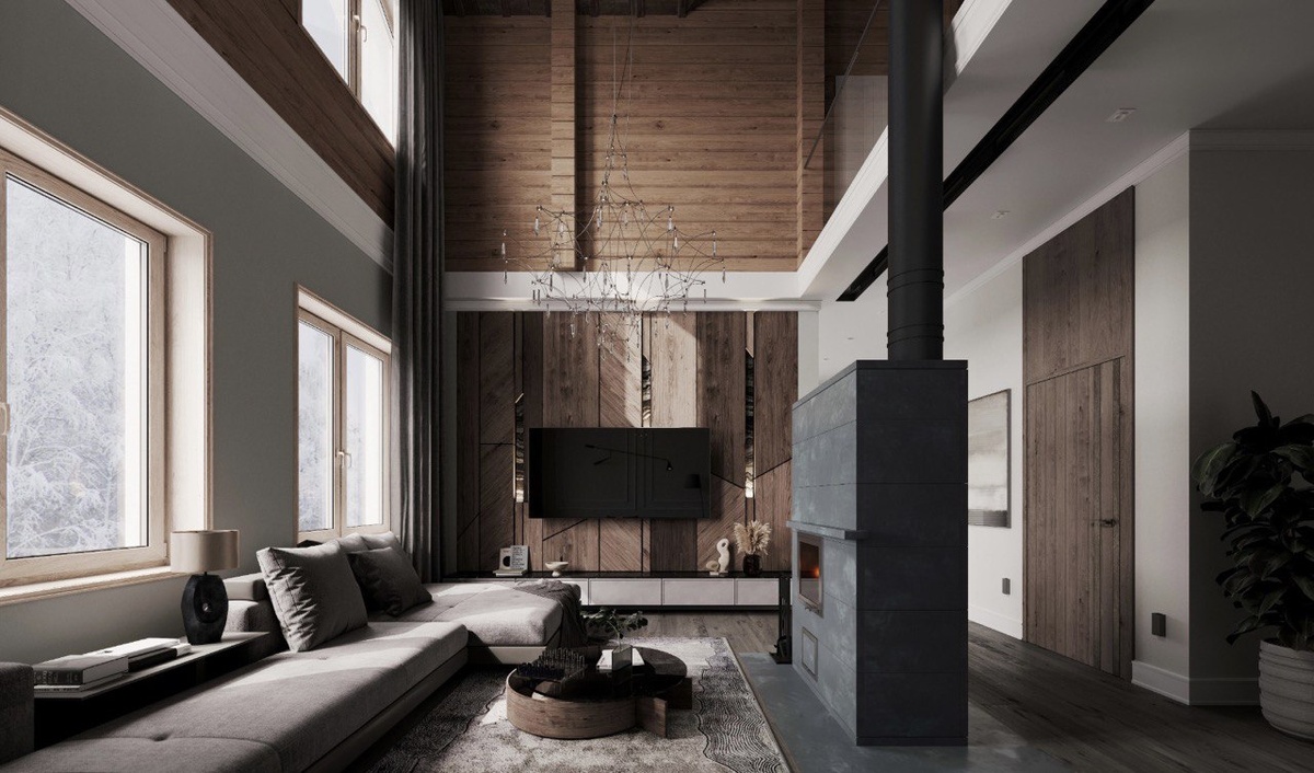 Двухэтажный дом 260 м2 в скандинавском стиле. Когда приступил к разработке дизайн-проекта, в доме была финская печь. Вокруг нее и разрабатывалась планировка. Архитектурное решение- комбинированный дом, первый этаж - каменный, второй из бруса. Задача была создать интерьер в деревянной части второго этажа, без «эффекта бани» ( когда все в вагонке) разбавить, так сказать, и связать элементами выполненными из древесных материалов с первым этажом, который каменный. Для этого подходит гостиная со вторым светом. Чтобы акцентировать дерево в гостиной, зона ТВ выполнена из декоративного панно со шпонированными панелями. Также высокие деревянные двери до потолка дополняют композицию на первом этаже. Надо заметить, что в этой связке также потолочная часть второго света, имеющая форму существующей крыши, облицована обожженной древесиной лиственницы. На втором этаже 3 спальни и одна из них мастер-спальня. В главной спальне нужно было разместить рабочую зону, санузел, гардеробную