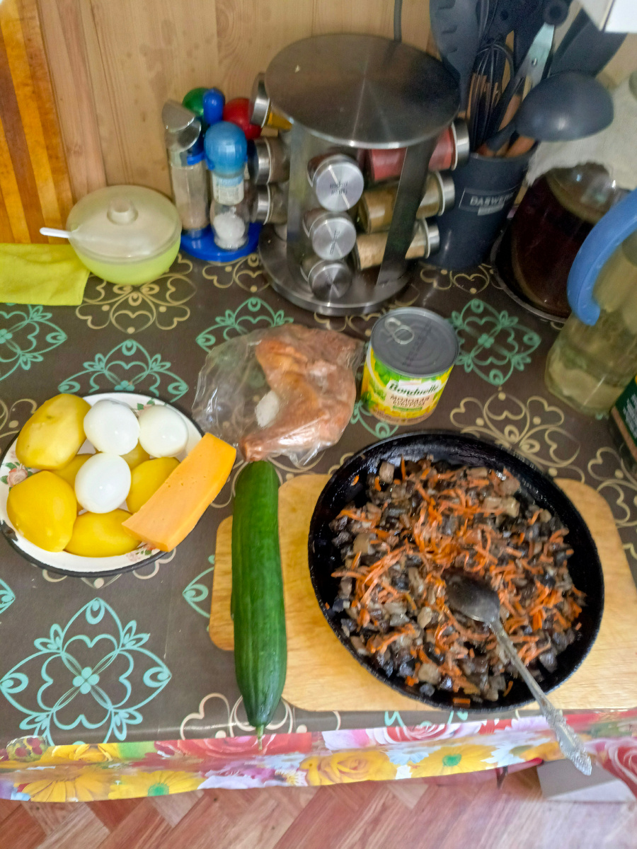 Картошка, свежие или соленые огурцы, яйца, сыр, кукуруза, лесные или шампиньоны грибы обжарить с луком и морковью, копчёная или отварная курица, зелень, майонез!