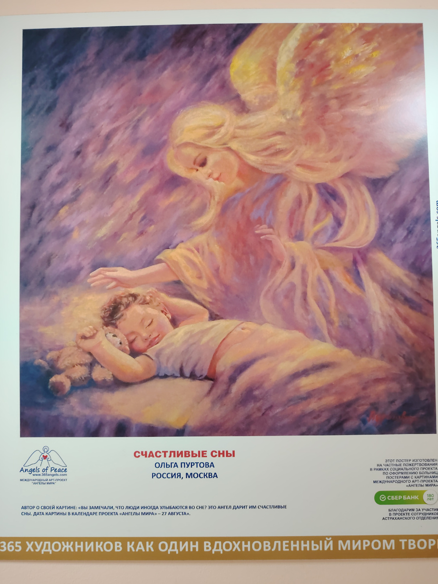 Давненько я не была в картинной галерее. А жаль, мне кажется, доченьке бы понравилось. Помню, в больнице был специальный стенд, там размещали рисунки детей на тему "Моё счастливое детство". Люда с удовольствием рассматривала каждую картинку. Так интересно, для каждого ребёнка, судя по его творению, счастье было своё. Жаль, не сфотографировала стенд. Там были и розовые пони, и дети на качелях, семья на пикнике с шашлыками, кошечки, собачки... Интересно, что нарисовала бы Люда? Для меня счастье - путешествия с семьёй 😍 Так хочется снова их возобновить. В Астрахани (может, и ещё где-то в другом городе тоже) была акция по оформлению больниц изображениями картин художников из разных уголков России. Спонсор - Сбербанк (всегда считала их ворюгами, но акция хорошая). В Ахтубинской больнице стены страшные и голые, а тут такая красота! Я собираю фигурки ангелов, поэтому с удовольствием рассматривала каждый постер. Особенно привлёк этот: Автор картины спрашивает: "Вы замечали, что люди иногда у