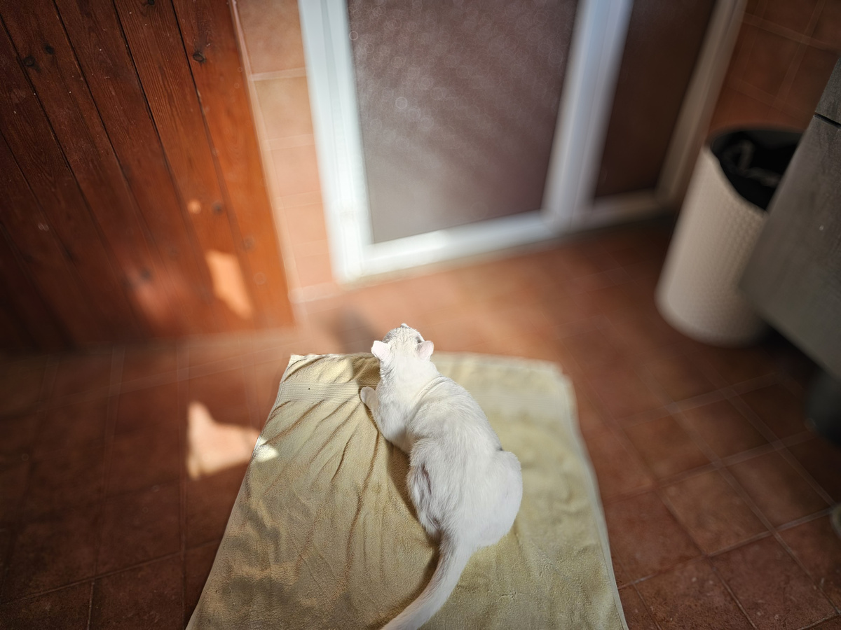 Утро было бурным. Погуляла со всеми собаками, подмела дом, прибралась у собак, всех покормила и побежала домой принимать душ и работать. Когда принимаю душ, Страшила всегда рядом и ждёт меня на полотенце для ног. В прошлом доме, когда было тепло, он ходил со мной в душ. Когда похолодало, то я пересекла его купания в воде, потому что при ВИК нельзя болеть. Кот, конечно, ещё рвался в душ, но потом отвык. А тут всегда караулит. Внимательно смотрит на дверцу, пасёт меня. Саги раньше этого не видел, а сегодня пришёл чистить зубы и застал картину. Он и сделал этот снимок. Душ тут настолько мощный, что пришлось привыкать к сильному массажу. Он аж лупит. И не регулируется. Мы купили насадку с регулировкой, но передумали её ставить. Потому что после такого мощного душа выходишь как из массажного кабинета. Страшилкин боится такого напора, поэтому всегда караулит меня под дверью. Глаз не сводит, не отвлекается ни на что. Хоть что роняй, хоть чем греми - кот свой пост не покинет. А вдруг в душ