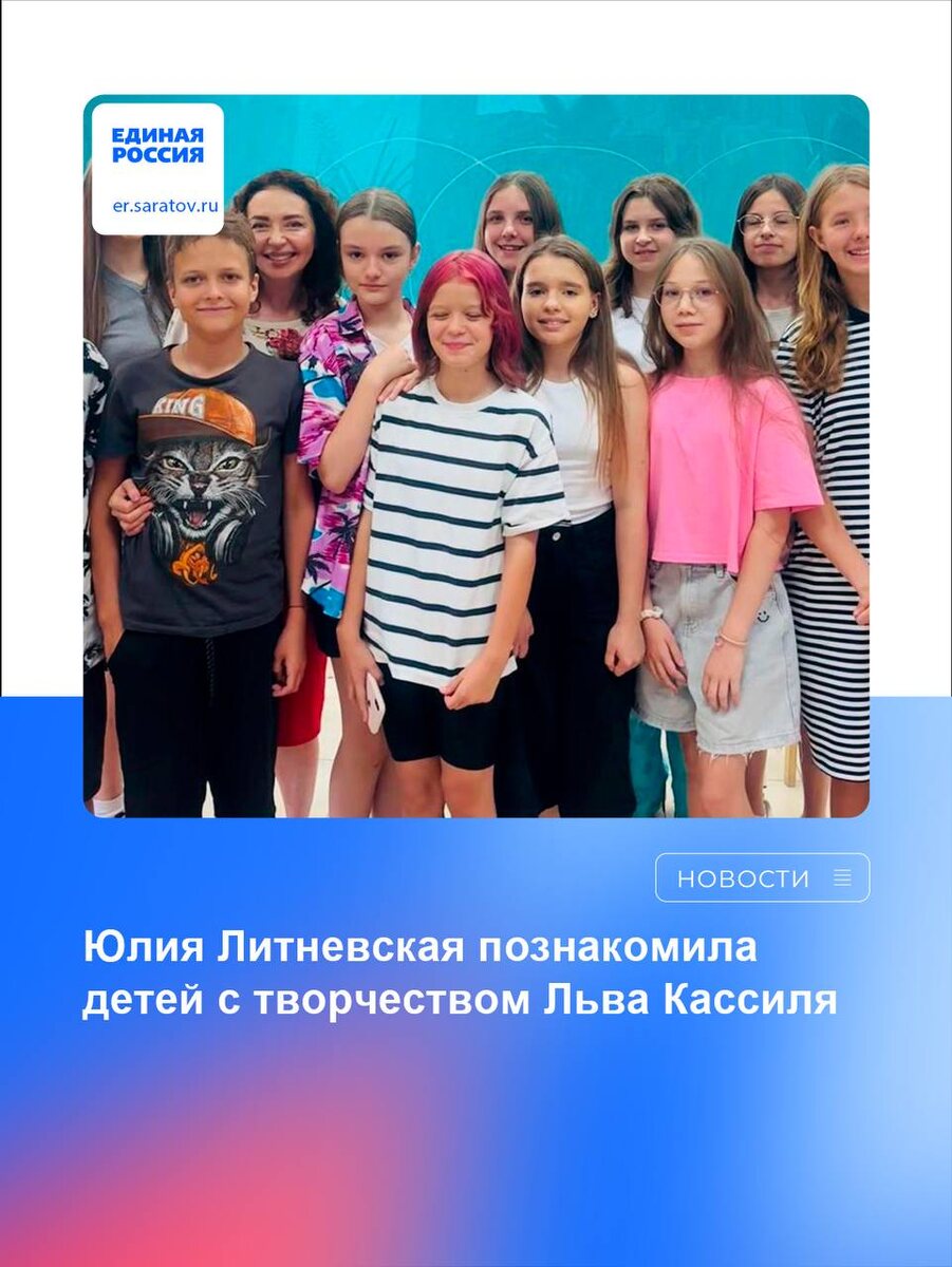 📚10 июля исполнилось 119 лет со дня рождения известного детского писателя, журналиста и сценариста. 🇷🇺Депутат Саратовской областной Думы, председатель Союза женщин России Саратовской области Юлия Литневская прочитала лекцию, посвящённую творчеству писателя, воспитанникам медиашколы и телестудии «Облака» в рамках реализации направления «Культура, история, традиции» народной программы партии «Единая Россия». А создатель и руководитель медиашколы Юлия Рачителева показала телевизионный репортаж из музея Льва Кассиля, созданный юными облаковцами. 🙋♂️Познакомившись с творчеством Льва Кассиля, дети активно приняли участие в дискуссии, заинтересовались произведениями, а также детством и юностью писателя. Особый интерес у них вызвали отсылки к Саратовской области, которые запечатлены в таких всемирно известных произведениях, как «Кондуит и Швамбрания», «Сказка об Алешке-Рязань и дядьке Беломоре». 💬«На набережной Волги в Саратове есть Аллея знаменитостей, связанных с Саратовом и Саратов