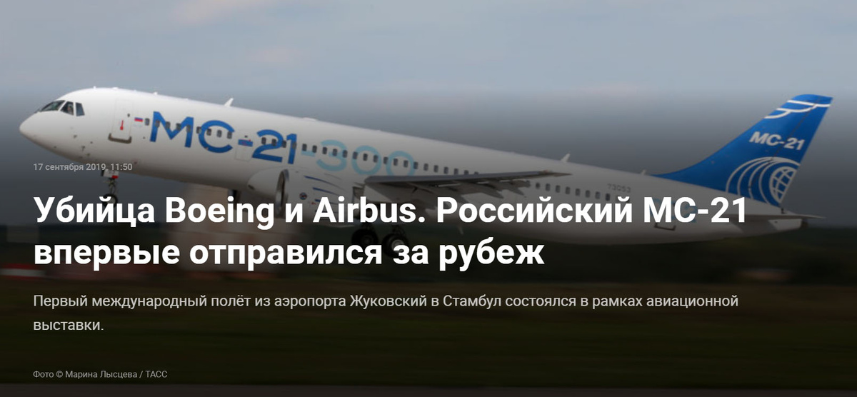 В чем не откажешь нынешней пропаганде, так это в умении создавать хлесткие и даже кликбейтные заголовки. Вот яркий пример такого подхода к пиару на примере российского авиалайнера МС-21: