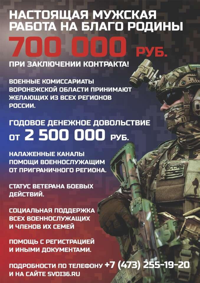 Военные комиссариаты Воронежской области принимают желающих из всех регионов России. Единовременная выплата при заключении контракта — 700 000 рублей. Годовое денежное довольствие – от 2 500 000 рублей. Налаженные каналы помощи военнослужащим от приграничного региона. Статус ветерана боевых действий. Социальная поддержка всех военнослужащих и членов их семей. Помощь с регистрацией и иными документами. Подробности по телефонам 122, +7 (473) 255-19-20 и на сайте svoi36.ru.