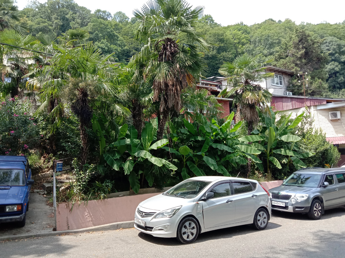 Хоста произвел на меня впечатление тихого уютного курорта для пенсионеров. Красивые дома, много зелени, бодрые бабульки на пляже, старики с удочками на волнорезах. То, что нам надо! Мы как раз приехали тихо и спокойно отдыхать, ездить на экскурсии, гулять по южным паркам, купаться, кушать вкусно и много. Свой гостевой дом мы нашли сразу, он напротив остановки "Хоста Мост", красивый дом с балкончиками. Хозяйка Джулия нас встретила, расположила в номере, все показала и рассказала. Номер у нас отличный, две кровати, диванчик, ванная комната, кондиционер, телевизор и свой балкон с шикарным видом. Приехали мы рано по местному времени, еще восьми часов не было. Сразу пошли на пляж и поискать что-нибудь поесть, а все закрыто. Еле нашли, где кофе попить. И сразу пошли купаться! Вода теплая, чистая, утром волн не было. Как я и говорила, купаются старички, ранние пташка. Народу еще не много. Красота! Потом позавтракали в столовой. Кормят вкусно, но мама сказала, что за тыщу завтракать это ра