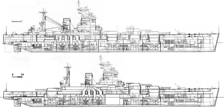 Высота 38мм ПТП уменьшается на метр, что даст экономию около 60т. Также, на 3″ уменьшается толщина носовой промежуточной палубы, — минус 13т.