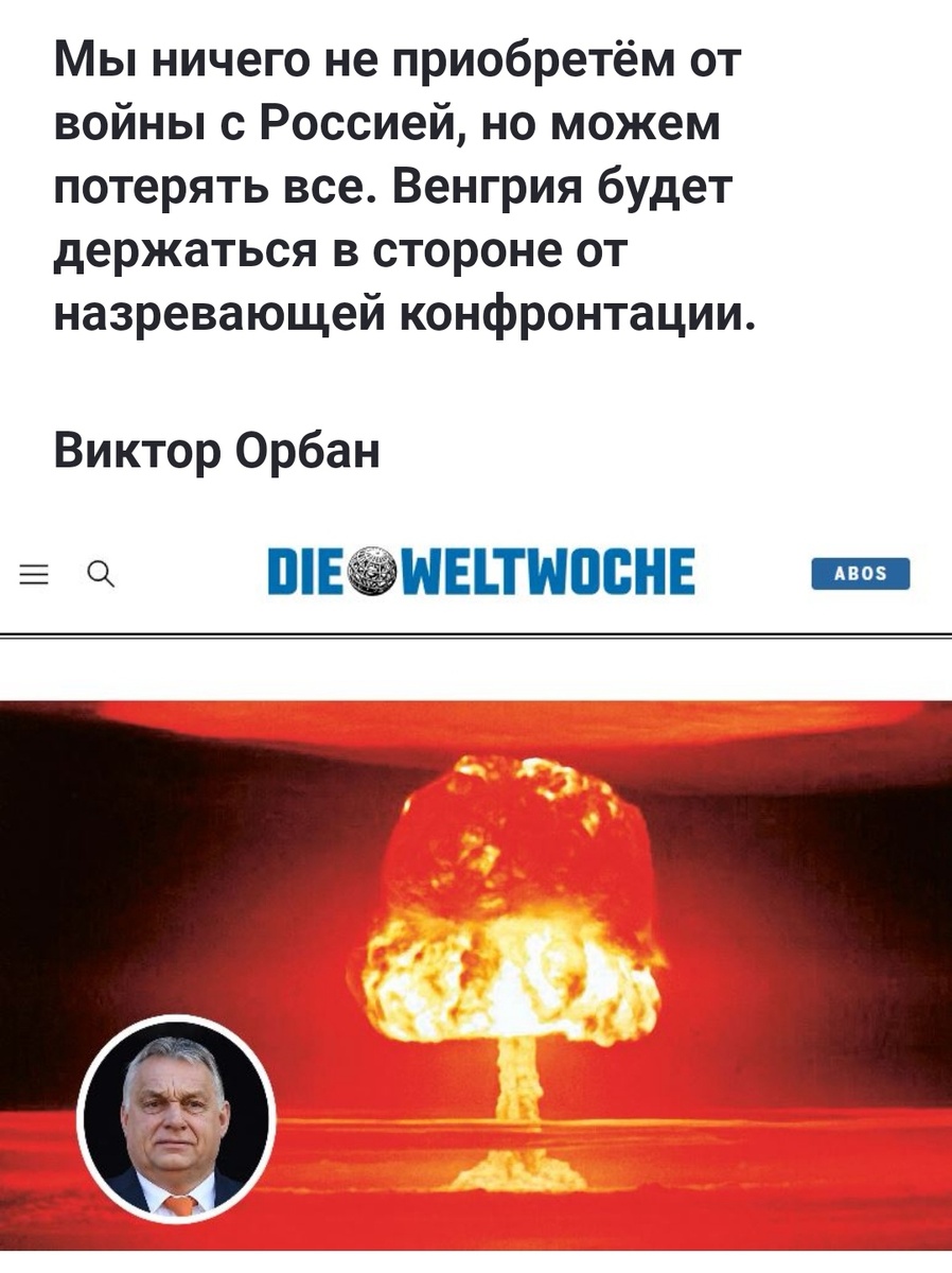 Прежде чем напомнить о статье венгерского президента, хочу обратить наше внимание на траекторию его движения. США - Украина - Россия - Китай - США. Интересно, что в самом начале этого миротворческого вояжа Орбан во всеуслышание заявил о своём видении процесса в статье "Европейские правительства в муках войны". Весьма интересно, носителем какой информации сегодня является Виктор? Ни он, ни Трамп, ни Путин, ни Си не доверяют средствам связи настолько, что используют венгра в качестве флэшки и говорящего письма. Из уст в уши, шёпотом и только наедине. Что же это может быть за миссия? И зачем было встречаться с Зеленским, если этот шлемазл ничего не решает? Как раз здесь всё понятно. Встреча в Киеве нужна была для прикрытия. Повод передать реплики американца русскому и китайцу - украинская встреча. Мирные инициативы - прикрытие. Но с другой стороны, Зеле вполне могли передать ультиматум. Но от кого? В планетарном смысле идёт сражение неоконов-глобалистов со старыми национальными эли