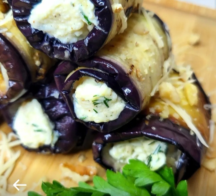 Подаються с грецкими орехами и натертым сыром. Просто, быстро и безумно вкусно! Баклажаны 2 шт Сыр плавленый 1 шт Яйца варёные 2 шт Чеснок 2 зубчика Майонез 2 ст. л. Зелень: укроп, петрушка Соль, перец чёрный молотый по вкусу Масло растительное для жарки 100 мл 1) Баклажаны нарезать на слайсы, посолить. Обжарить с обеих сторон на сильном огне на сковороде с добавлением растительного масла. Выложить на бумажное полотенце. 2) Вареные яйца и плавленый сыр натереть на средней терке, добавить специи, мелко нарезанную зелень и чеснок, пропущенный через пресс, заправить майонезом, перемешать. Начинка готова. 3) На слайсы баклажана выложить начинку. Свернуть в рулет. Сверху посыпать дроблеными грецкими орехами и натертым сыром. Можно подавать. Приятного аппетита, друзья ❤️