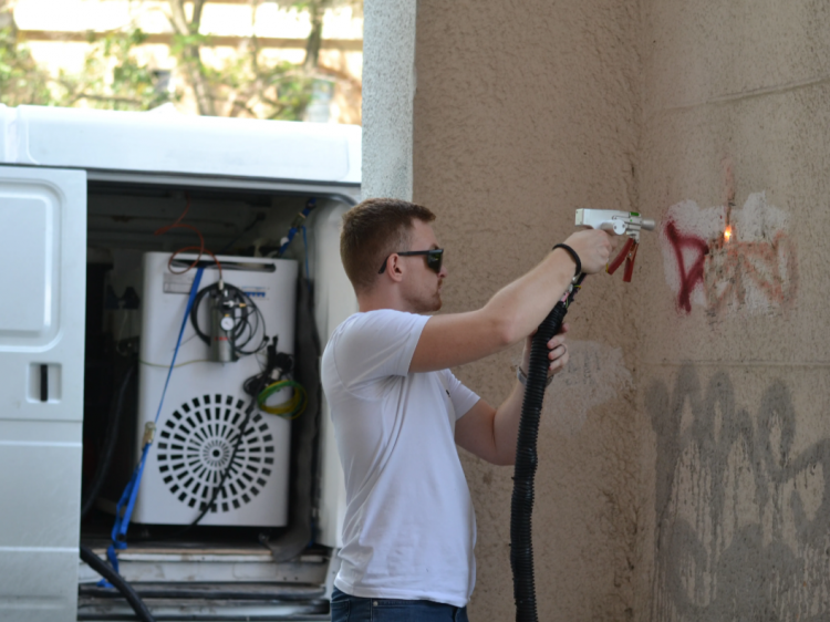 В Волжском продолжают бороться с незаконными граффити на фасадах многоквартирных домов. Как рассказали Волжский.ру в городской администрации, предприниматели в качестве подарка городу применяют инновационный для всей Волгоградской области метод очистки поверхностей. С помощью лазера удалил рекламу с домов № 4, 6, 8, по проспекту им. Ленина и № 1 по улице им Аркадия Гайдара. Обычно рисунки просто закрашивают, после чего на стенах остаются неэстетичные разноцветные квадраты. Лазерная чистка помогает избежать эффекта лоскутного одеяла.