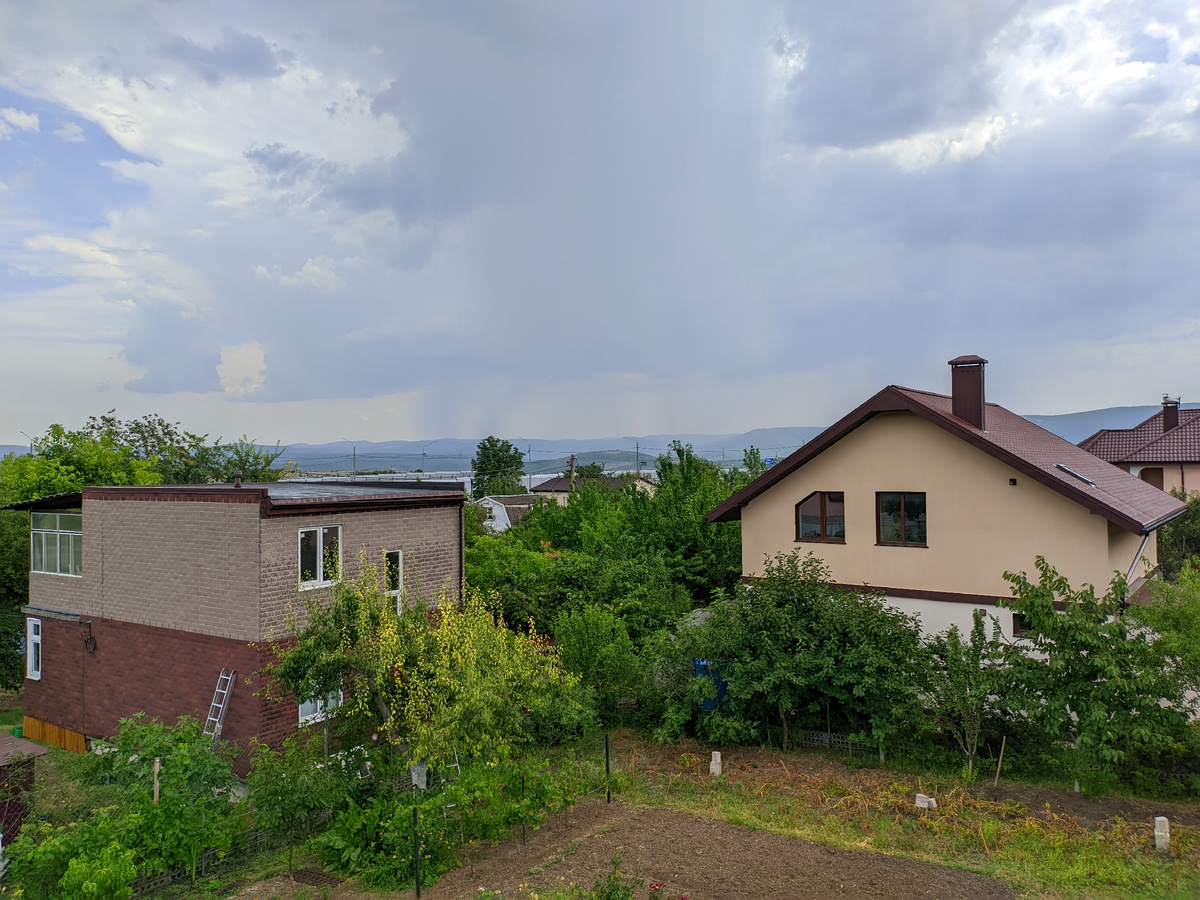 Ночью, когда мы закончили все свои дела, вышли во двор, было жарко и душно, пошли обратно в дом, там тоже жарко. Пришлось на кухне включить на ночь кондиционер, погода в доме наладилась, +27С, спать было комфортно. Утром встали, опять жарко, к тому же на улице с утра сильная пасмурность и грозовые тучи. Залез в прогноз, опять обещали дождь. Слегка где-то вдали громыхнуло и сверкнуло. Потом грохот стал ближе, а тут еще пролетел реактивный самолет. Стою, рассматриваю небо, пытаюсь увидеть самолет сквозь грозовые облака. По ногам резко обдуло ветром, это мимо меня пронеслась галопом Дымка, заскочила в дом и сразу в спальню, под нашу кровать. Странно, обычно её не пугал ни шквальный ветер, ни грохот мощной грозы, ни даже первые налеты чубатых ракет, вернее шум их уничтожения нашими доблестными воинами. А тут самолет пролетел и Дымка уже под кроватью. Про остальные хвосты даже говорить не буду, они уже нашу кровать вокруг облепили с первыми дальними раскатами грома. Мы позавтракали оладьями