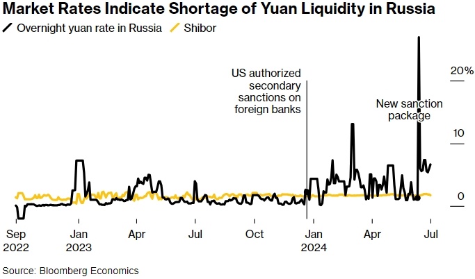 "Желание Москвы использовать юань в платежах, кажется, оказалось выше готовности китайских банков к этому", - говорит Алекс Исаков, экономист по России в Bloomberg Economics. "Угрозы вторичных санкций со стороны США пугают банки". По его словам, рынок указывает на нехватку юаней в России, а также на нежелание китайских банков предоставлять ликвидность.