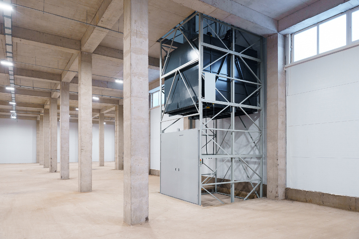 Канатный шахтный грузовой подъемник на две остановки с непроходной кабиной предназначен для перемещения грузов между первым и вторым этажом производственного здания. Полностью закрытая грузовая платформа (кабина) ездит внутри несущей металлокаркасной шахты и может делать две остановки для погрузки/разгрузки.