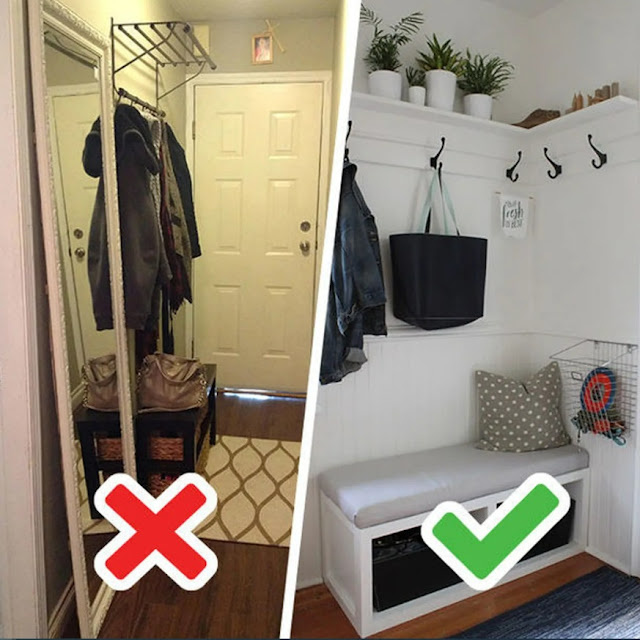 Небольшая прихожая с большим количеством мебели, мелких деталей и «декораций» будет выглядеть захламленной. Ощущение беспорядка создает и открытая вешалка с верхней одеждой, небрежно выставленная на полу или в открытых полках обувь, разбросанные на всех горизонтальных поверхностях сумки, шапки, варежки и другие вещи.