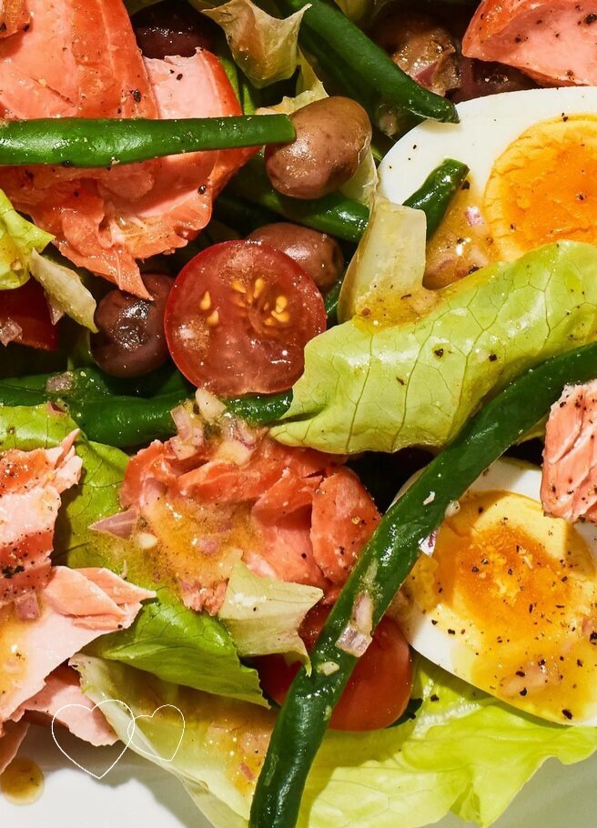Припасенный в морозилке кусочек горбуши горячего копчения сподвиг меня к поиску новых интересных рецептов. И вот он - салатик из свежих овощей с рыбой и очень интересной заправкой. Попробуем! Кроме небольшого кусочка красной рыбки горячего копчения грамм 100-150, еще понадобится: 2 стол.ложки оливкового масла, лимонный сок 1 стол.ложка, чеснок измельченный 1 зубчик, зелень кропа, соль и черный перец по вкусу. Получилось очень вусно и свежо.