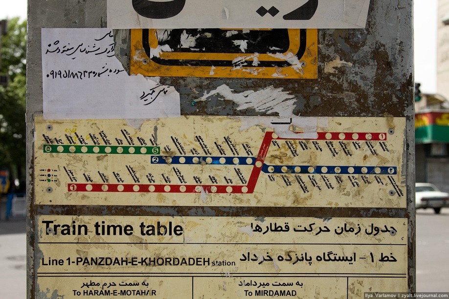 Перед входон на станцию, на улицах и на самих станциях висят схемы метро. Все названия на двух языках: фарси и английском.