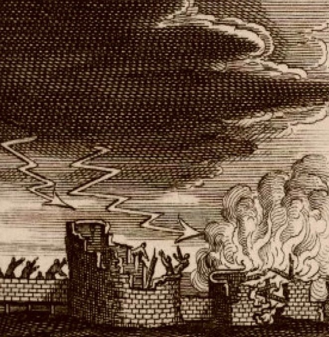 «1667 г. июля в 12 день бысть во граде Хлынове гром страшен и молния, и от молнии сгорел двор монастырской со всякою збруею конскою.