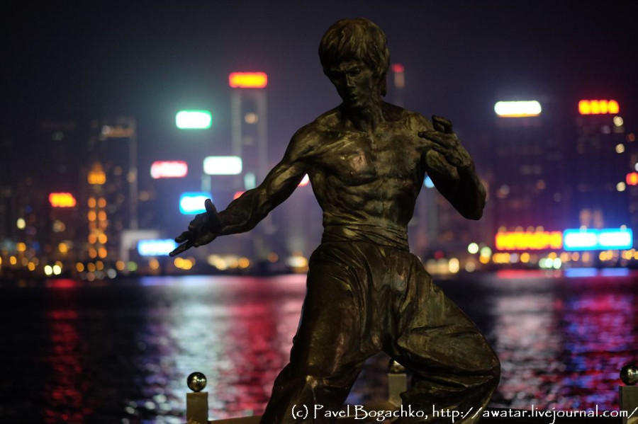 В Гонконге между прочим в своё время открыли новый жанр кинематографа. Жанр "Киий-аа!" собственно и заложил основы кинематографа Гонконга. Брюс Ли - звезда гонконгского кино на все времена. На набережной установлено наверное звёзд сто, мне интересны только немногие Чоу Юнфат. Его Ли Мубай в "Крадущемся тигре, затаившемся драконе" был великолепен. Джет Ли. Прекрасен в "Герое" Вонг Карвай. Его "Любовное настроение" я смотрел в самолёте, направляясь в Шанхай. Тонкий, чувствующий режиссёр. Джеки Чан. Человек-легенда. Мэгги Чун. Как она хороша в "Любовном настроении" Вонга Карвая! Пожалуй хватит для одного поста. Смотрите в следующей серии: Болотная площадь разваливает страну, трамвай на кладбище, люди перестали пользоваться занавесками и львы-мутанты подстерегают за углом. Скандалы! Интриги! Расследования! Мы прерываемся на ужин и сон. Не переключайтесь! А к тем, кто переключится, ночью во сне придёт Чехов. И будет читать "Каштанку". Всю ночь, до утра. Часть первая - Гонконг. Город Част