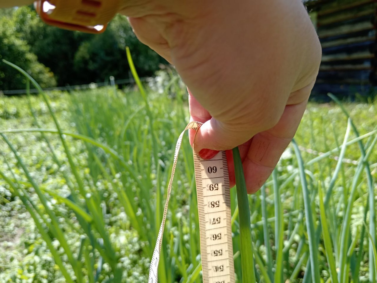 Лук вырос на 60 см на грядке. Вношу подкормку для крупных луковиц