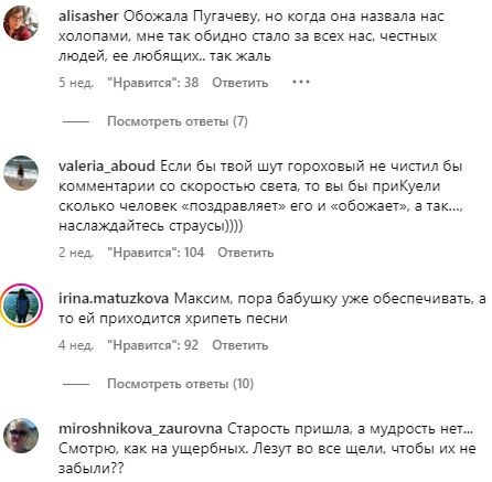 Свежий пост стал для оставшихся поклонников Пугачевой полной неожиданностью. Многие отметили, что в этот раз Алла сильно перегнула. Публиковать его здесь я не буду, но комментарии приведу: