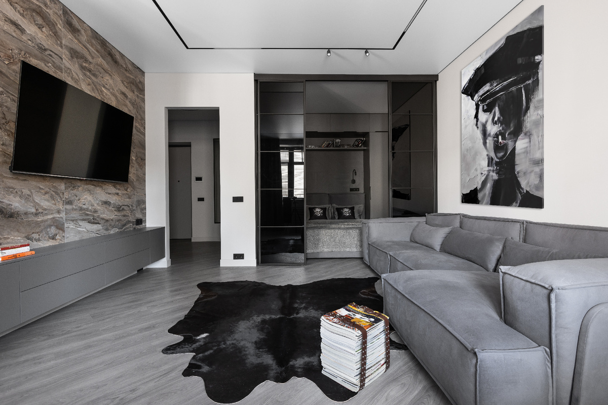 Дизайн интерьера, который выбирает мужчина, чаще всего отражает его предпочтения к функциональности, рациональности и простоте. Мужской интерьер — это особенное представление о стиле. Смелый, комфортный, практичный и ничего лишнего. В начале работы над проектом заказчик выразил свои предпочтения — темный интерьер с минимумом деталей. Так цветовая гамма студии наполнилась уютными оттенками серого и акцентными черными деталями. В квартире два огромных окна, которые совершенно не хотелось закрывать. Так появились графичные черные жалюзи и возникла возможность управлять освещенностью. В случае, когда стоит задача создать минималистичный интерьер, необходимо продумать способы отделки, чтобы стены выполняли функцию декора. С этой задачей отлично справились гипсовые панели, из которых я создала панно в коридоре и спальне. Так как нам хотелось максимально использовать каждый сантиметр пространства, мебель мы приобретали на заказ. В прихожей удалось спроектировать большую гардеробную и вместите