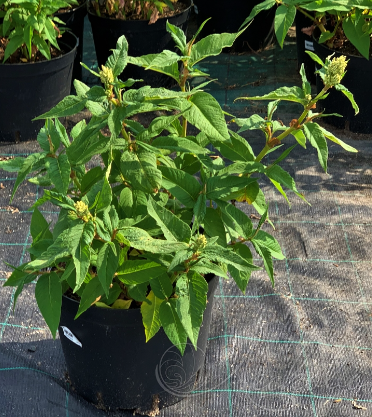 Листья крупные, до 10 см, продолговатые, ланцетные. Цветки мелкие, от белого до светло-розового оттенка, собраны в очень крупные разветвленные метельчатые соцветия.