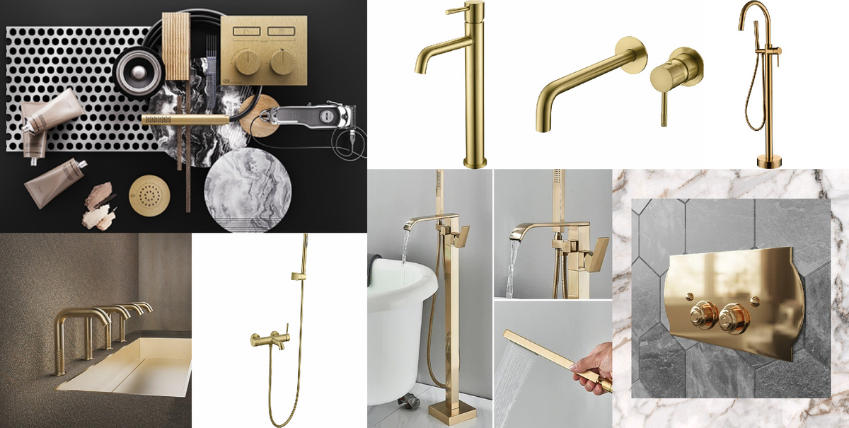Золотая сантехника , а именно смесители, клапаны, душевые системы, полотенцесушители и т д является юзюминкой для дизайна интерьера санузла для тех, кому хочется получить эффект роскоши, элегантности и элитности. Такие покрытия сантехнических изделий идеально сочетаются с природными текстурами (мрамор, оникс, древесина и т д). 10 лет назад подобная сантехника, вызывала противоречивые чувства у дизайнеров, потому как вызывало эффект «подделки», ассоциируя с бюджетной одеждой под известные бренды. Но сейчас золотая сантехника вошла в тренды, где прочно заняла свое место. Однако, с такой сантехникой нужно быть аккуратным, чтобы не получить безвкусицу или перегруженность интерьера помещения. Безвкусица выражается в разной фактуре изделий, к примеру, смеситель раковины в матовом золоте, душевая система глянец и т д, все должно быть в одном покрытии : либо мат, либо глянец. Точно такой же эффект получается, если покупать изделия разных производителей или даже разных коллекций, потому как одн