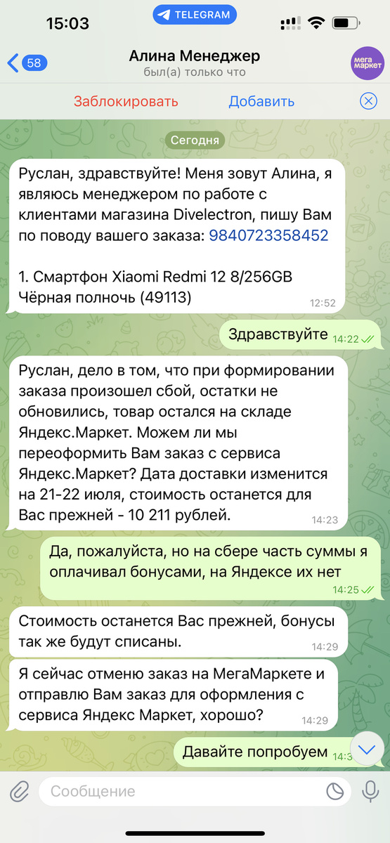 Сегодня заказывал в подарок телефон на день рождения, на Сбермаркете на него была плюс минус средняя цена 11990 и у меня было небольшое количество бонусов, которыми я хотел оплатить часть заказа. Спустя пару часов после оформления заказа мне в телегу (очевидно, по номеру телефона), пишет некая Алина от имени продавца с маркетплейса и на первый взгляд меня даже ничего особо не смутило: И даже стоимость указана точная, с учетом списанных бонусов. Деньги действительно пришли, т.е. у собеседника так или иначе была возможность отменить заказ. Перехожу в почту, сразу смутил адрес отправителя. При клике на продолжить видим вот такую адресную строку: Далее я решил поинтересоваться что это вообще. После этого вопросов особо не осталось, на всякий случай написал непосредственно в поддержку ямаркета рассказав детали, сказали, что без вариантов мошенничество. Далее решил писать в сбермаркет, чтобы получить разъяснение каким образом мои данные меньше чем за 2 часа попали к мошенникам, т.к. за неско